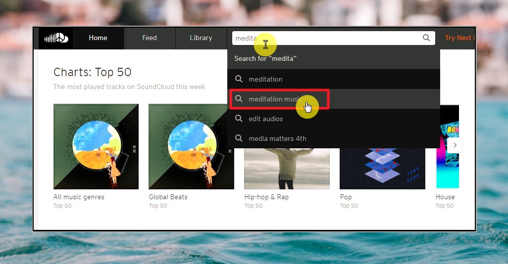 사운드클라우드 닷컴 사이트에 접속했습니다. 이곳에서는 명상음악 외에도 다양한 장르의 곡을 무료로 들을 수 있는데요. 국내 유명곡도 많이 있어요. 일단 이번 시간에는 명상을 위한 곡을 연속으로 이용하는 방법에 집중할게요. 사이트에 접속하면 화면 중앙 상단에 검색창이 하나 있습니다. 해당 검색창을 클릭한 후 "meditation music"를 입력한 후 엔터키를 눌러 주세요. "medita" 정도만 입력하면 자동 완성 키워드가 검색창에 뜨는데요. 그때 풀네임을 클릭하면 편리합니다.