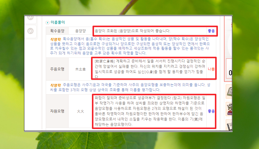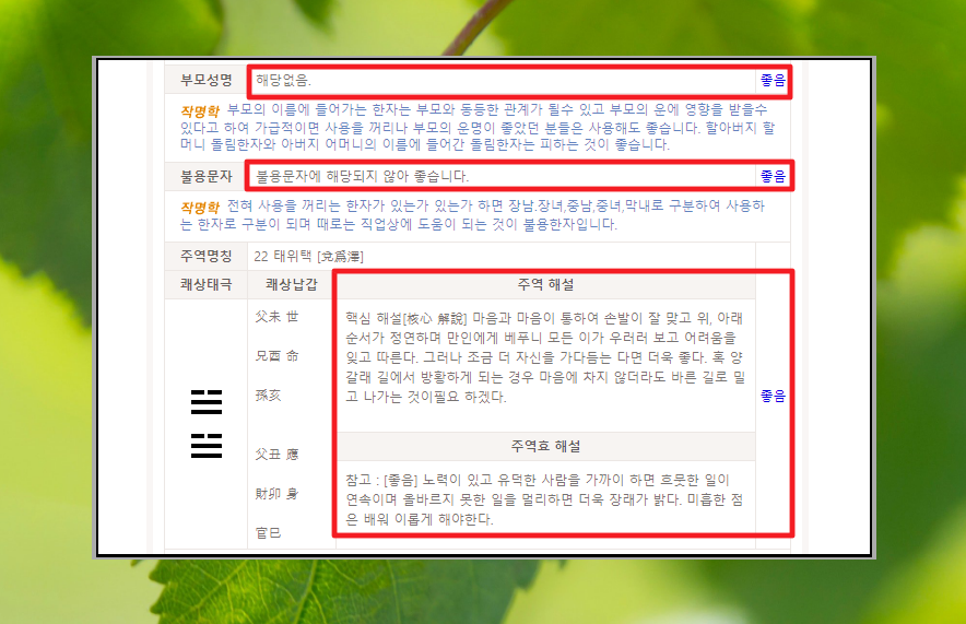 부모와의 관계에 있어서도 나의 성명이 얼마나 좋은지 알아볼 수 있습니다. 성명에 사용하지 못하는 불용문자를 사용했는지 여부도 쉽게 파악이 가능합니다. 마지막으로 주역을 바탕으로 이름에 사용한 한자에 대한 평가와 해설을 만나볼 수 있어요.