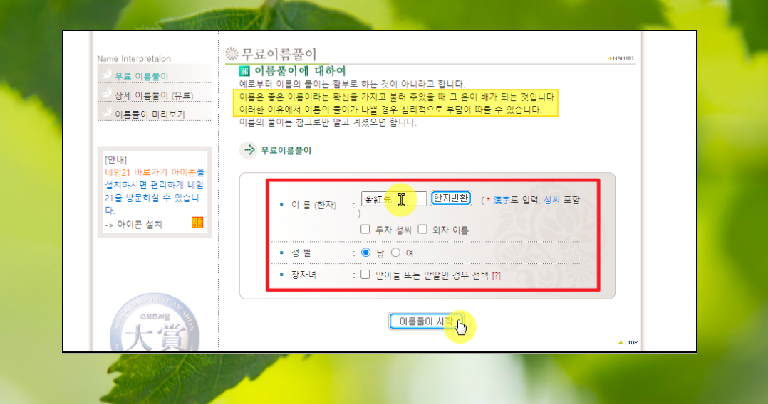 "네임21" 사이트에 접속했습니다. 안내 문구를 읽어보니 좋은 이름을 갖는 것이 정말 좋다고 합니다. 운을 배로 만들어 주고, 반대로 나쁜 풀이를 가진 것의 경우에는 심리적으로 부담을 줄 수 있다고 하네요. 그럼 해당 서비스를 이용하기 위해 성명, 성별, 장자녀 여부를 입력해 보겠습니다. 다 입력한 후 [이름풀이 시작] 버튼을 클릭해 주세요.