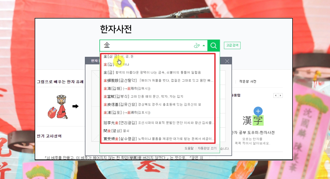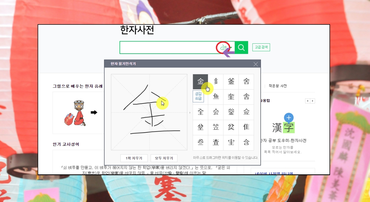 이전 단계에서 필기인식기를 이용하면 다음과 같이 검색 창에 한자가 입력되는데요. 그 아래에 있는 자동완성 문구에서 알아보고자 하는 것을 마우스로 클릭하면 됩니다.