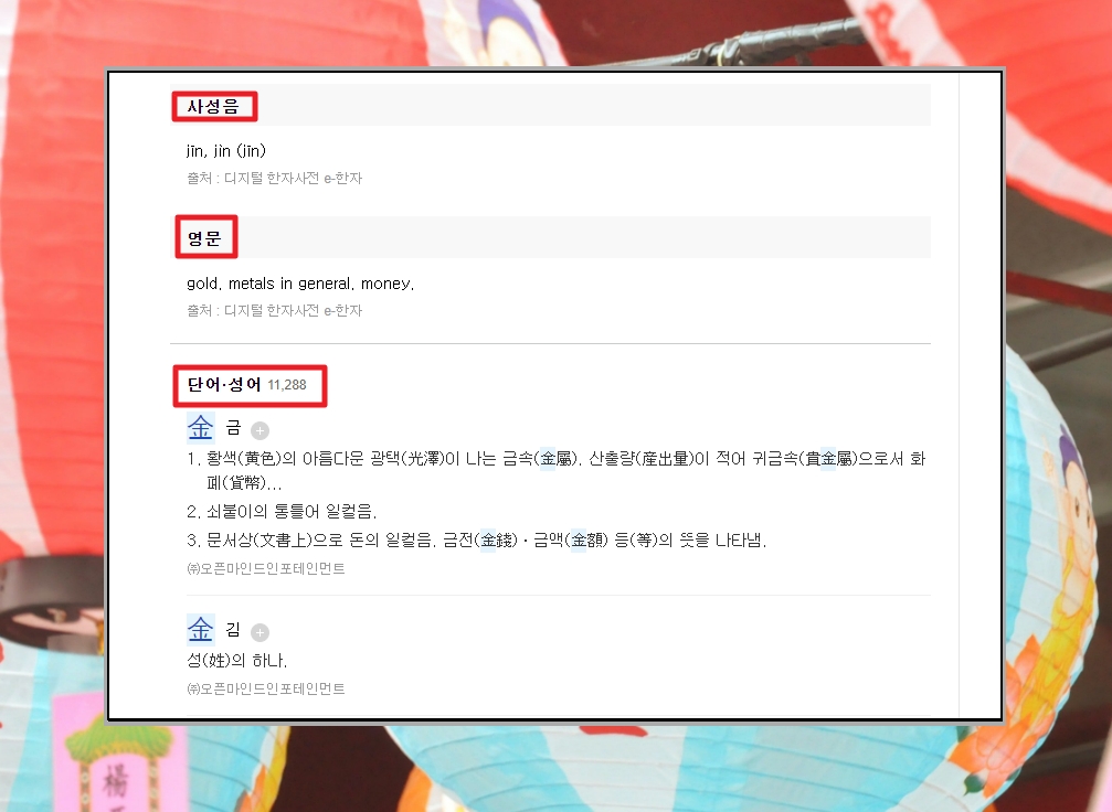 마지막으로 사성음이나 영문 변환 결과, 단어, 성어를 확인할 수 있는데요. "쇠 금"에 관련된 단어와 성어의 수가 11,288개나 될 정도로 굉장히 많습니다. 모두 살펴볼 수 있으니 알아보고자 하는 것이 있으면 클릭해 보세요.
