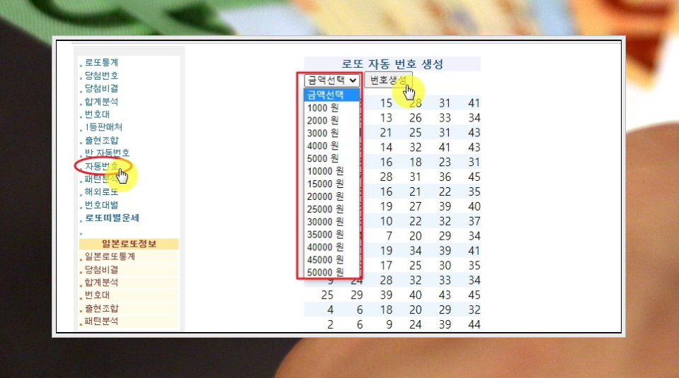 7. 이곳에서는 자동으로 로또 번호를 추천해주는 프로그램도 제공하고 있는데요. 복권을 구매할 금액을 선택한 후 [번호 생성] 버튼을 클릭해 보세요. 그럼 해당 금액에 맞는 횟수로 번호를 추천해 줍니다.