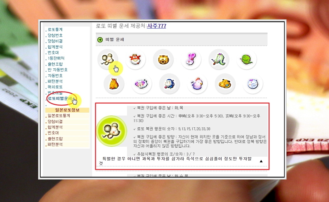 8. 마지막으로 1등 판매점과 당첨지역 정보와 더불어 함께 이용하면 좋은 서비스를 알려드리겠습니다. 바로 로또 띠별 운세입니다. 본인의 띠를 선택하면 복권 구입하기 좋은 날, 구입하기 좋은 시간, 행운의 숫자, 복권 구입에 좋은 방향 등을 확인할 수 있습니다.
