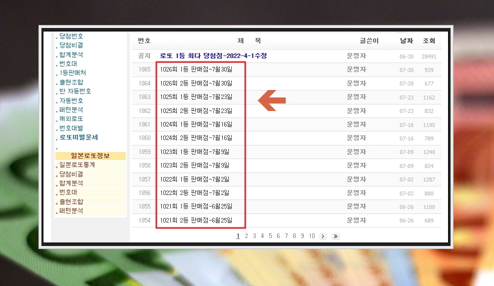 3. 고베스트 사이트에 접촉하면 메인화면에서 좌측 상단에 위치한 [로또 게시판]을 클릭해 주세요. 그럼 다음과 같이 통계, 1등 판매처, 번호 생성기, 분석 자료, 띠별 운세 서비스를 선택할 수 있는 게시판이 나타납니다. 좌측에 있는 메뉴에서 [당첨비결]을 클릭하면 회차별로 추첨일, 보너스 번호, 번호합계, 홀짝수조합, 연속번호가 정리된 표가 나타납니다. 해당 표를 확인한 후 메뉴에서 [1등 판매처]를 클릭해 주세요.