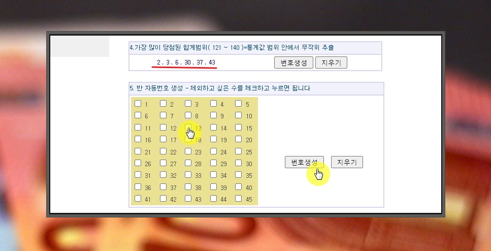 6. 반 자동 생성기를 이용할 때 사용하고 싶지 않은 번호를 제외 시킬 수도 있습니다.