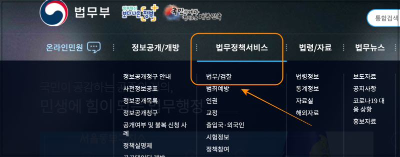 법무수 사이트에서 무료양식 자료를 다운 받으려면 메뉴에서 "법무정책 서비스"를 클릭해 주세요. 그럼 여러 가지 하위 메뉴가 나타나는데요. 가장 첫 번째에 있는 "법무/검찰"을 클릭해 주세요.