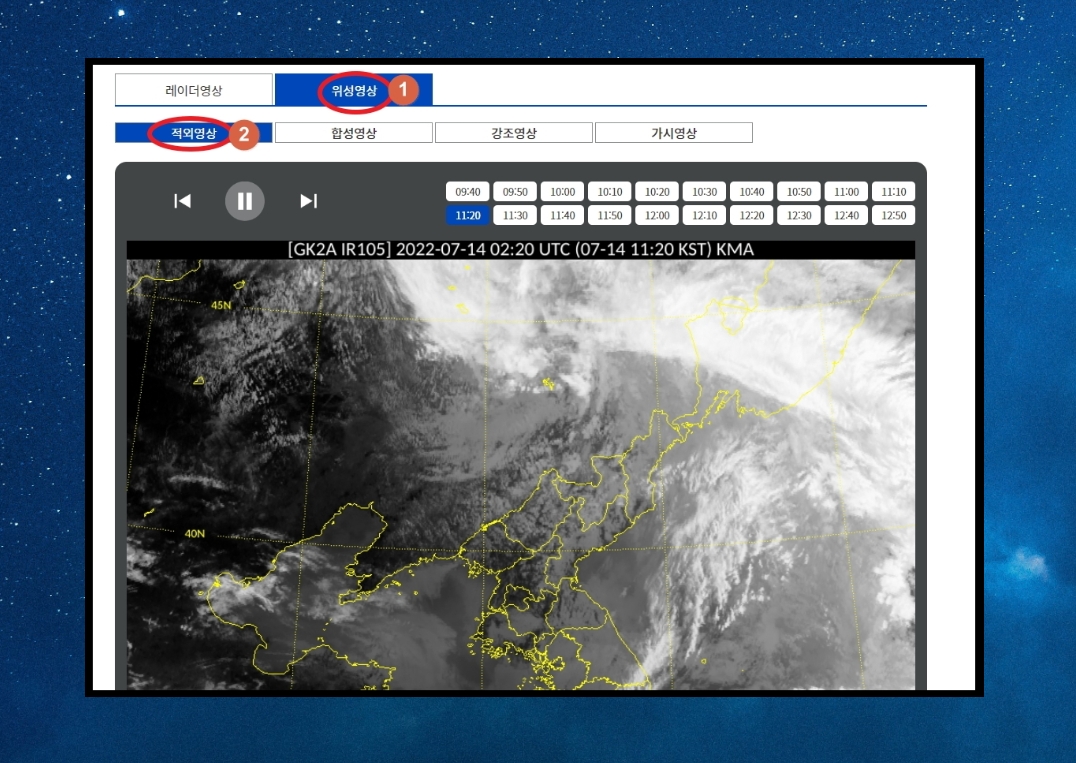 7. 다음은 위성영상 메뉴를 클릭해보겠습니다. 적외영상, 합성영상, 강조영상, 가시영상 이렇게 네 가지 종류가 마련되어 있는데요. 이를 통해 실시간으로 흐름 및 변화 확인을 할 수 있습니다. 여기서도 재생 버튼을 누르면 위성사진이 영상처럼 움직이는 것을 확인할 수 있어요.