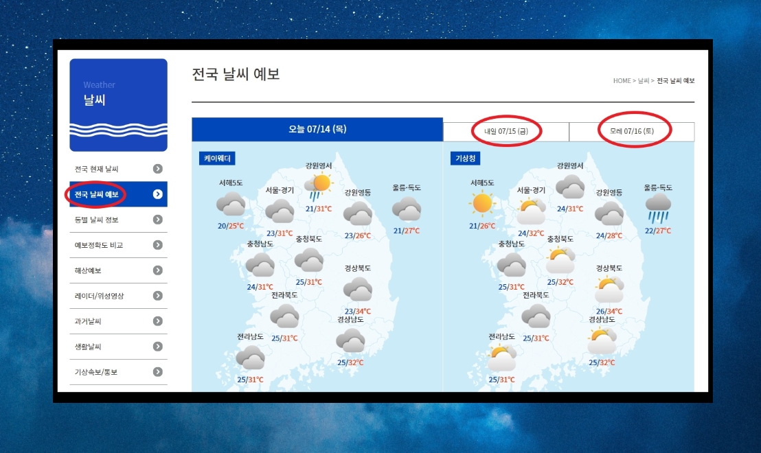 9. 이곳에서는 좌측에 있는 메뉴를 통해 다양한 정보에 접근이 가능합니다. [전국날씨예보] 메뉴를 선택해 보면 오늘은 물론이고, 내일과 내일 모레 상황을 확인할 수 있죠.