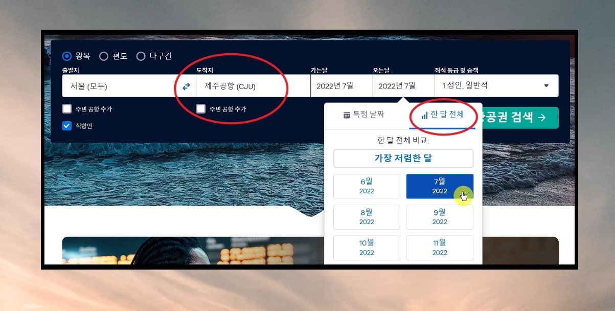 일단 사이트에 접속하면 찾아보고자 하는 티켓에 대한 정보를 입력해야 합니다. 도착지를 제주공항으로 입력하고, 날짜의 경우에는 한 달 단위로 선택해주세요. 그럼 해당 월에 가장 저렴하게 나온 비행기표를 구할 수 있습니다.