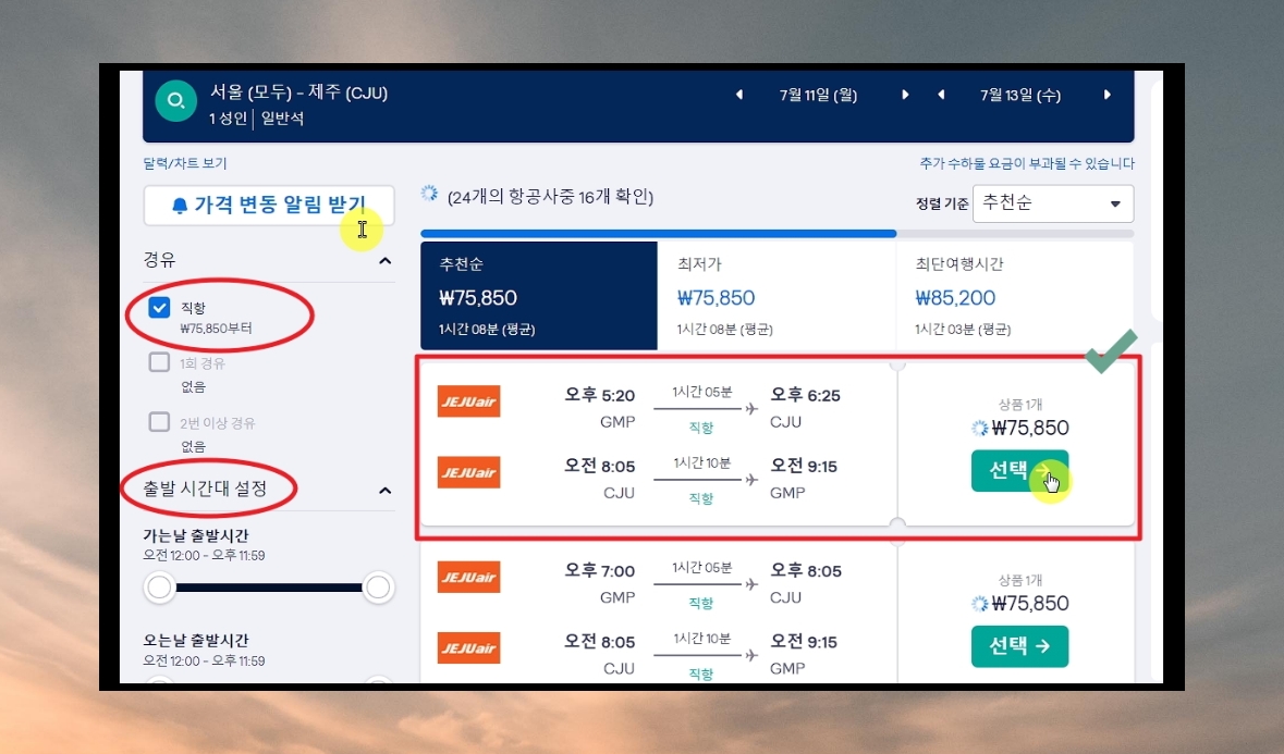 현 시점에서 가장 저렴한 티켓을 구할 때 도움이 되는 항공권 가격 비교 사이트를 이용해 보았습니다. 제주와 같이 국내 여행을 가는 경우에는 직항을 꼭 확인 및 체크해주세요. 경유를 하면 비행기 이용 시간이 늘어나고, 오히려 비용이 늘어날 수 있기 때문입니다.