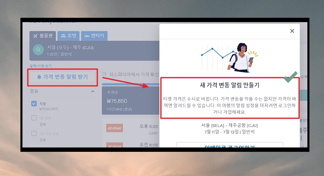 스카이스캐너에서 저렴하게 예약을 할 수 있는 제주행 티켓을 발견하면 본인에게 알려줍니다. 알림을 받은 즉시 제주항공권을 예매하면 지금 찾은 것보다 더 싸게 진행할 수 있습니다.
