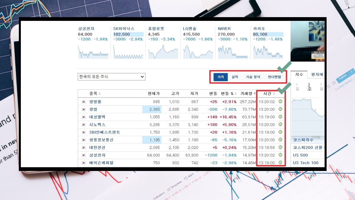 1. 여러 주식 종목에 대한 시세 정보를 한눈에 보고 싶을 때 다음과 같은 서비스를 이용합니다. 당연히 무료이고, 실시간으로 현재가, 고가, 저가, 변동비, 변동치, 거래량이 확인할 수 있죠. 다음은 표의 정보를 가격 기준으로 설정했을 때 나오는 화면이고, 실적이나 기술 분석, 펀더멘탈 기준으로 정보를 변경할 수 있습니다.