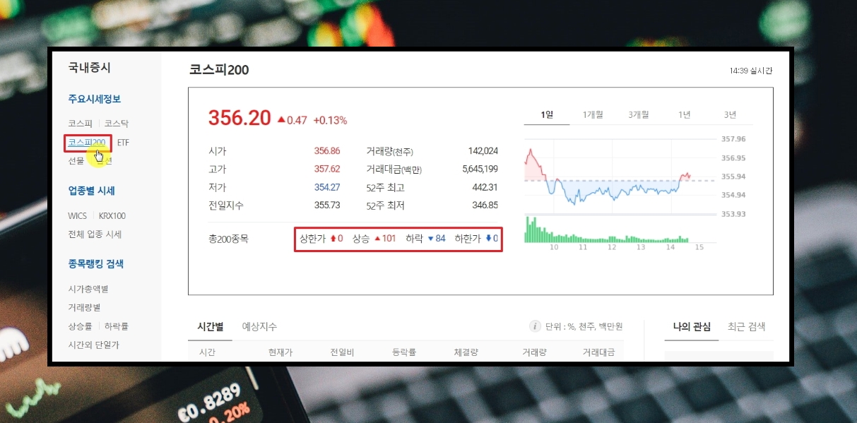 3. 새롭게 열린 페이지를 보면 좌측에 여러 메뉴가 있습니다. 주요시세정보 카테고리에서 [코스피200]을 선택합니다. 그럼 해당 지수에 대한 시가, 고가, 저가 등은 물론이고, 코스피200 종목에 대한 상한가, 상승, 하락, 하한가 주식 정보도 확인도 가능합니다. 해당 지수에 대한 그래프 확인도 가능하죠.