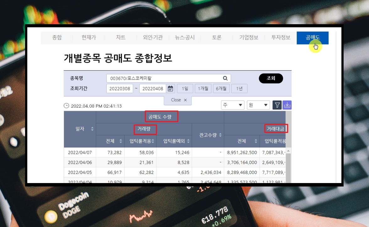 7. 요즘 개인 투자자들의 관심을 받고 있는 부분은 공매도 입니다. 공매도 때문에 주가가 떨어진다고 생각하기 때문입니다. 공매도 메뉴를 클릭해 보면 해당 종목에 대한 공매도 정보 확인이 가능합니다.