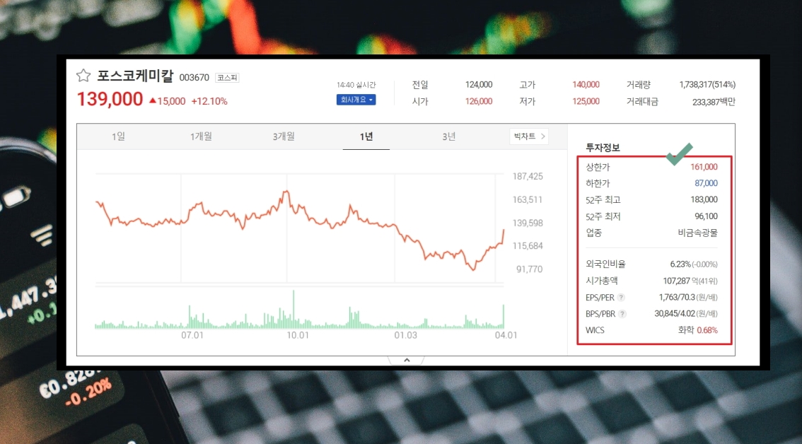 5. 코스피200 리스트에서 관심이 있는 주식의 이름을 마우스로 클릭해 봅니다. 그럼 해당 기업에 대한 상세한 정보 확인이 가능합니다. 그래프는 물론이고, 투자에 도움이 되는 외국인 비율, 시가총액, PER, BPS 등을 확인할 수 있습니다.