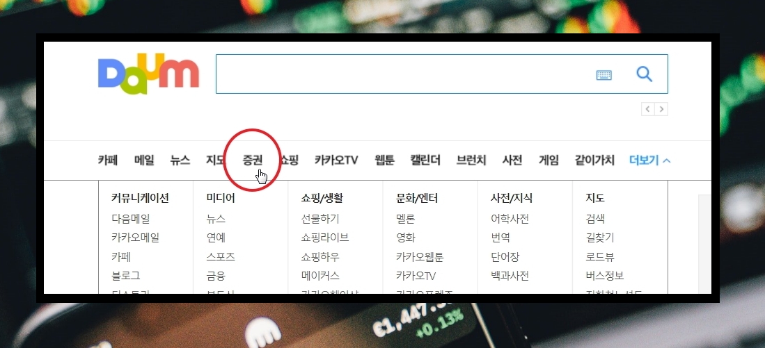 1. 국내 유명 포털 사이트인 다음을 이용하여 원하는 리스트를 조회해 보겠습니다. 여기에 더하여 주식 투자를 할 때 참고하기 좋은 정보 얻는 방법도 함께 알려드리겠습니다. 다음 사이트에서 메뉴 선택을 통해 증권 서비스로 이동해 보겠습니다.