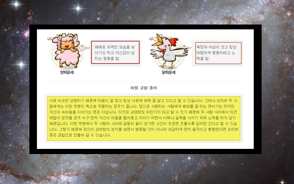 본인과 상대의 띠에 따라 궁합이 잘 맞는지 또는 그렇지 않은지 풀이를 통해 확인해 볼 수 있습니다. 당연히 궁합 풀이를 보는 것은 무료이고요. 재미있게 보기만 하면 됩니다.