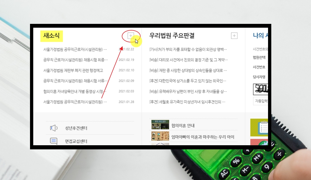 2. 서울가정법원 사이트에 접속했습니다. 메인화면에서 좌측 중앙을 보면 "새소식" 부분이 있는데요. 여기에서 플러스 버튼을 클릭해 보세요.