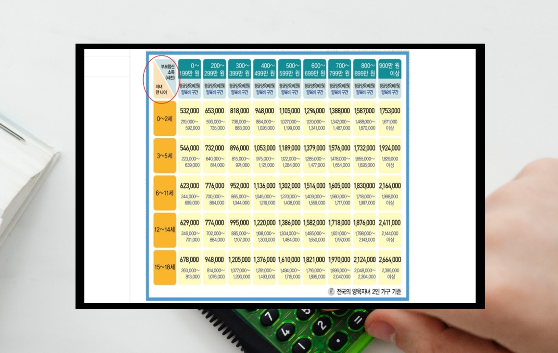 일단 기본 원칙은 자녀에게 이혼 전과 동일한 수준의 환경을 유지하는 것이고, 이혼할 당시 소득이 없더라도 최소한의 자녀 양육비에 대한 책임을 분담해야 한다고 해요. 계산보다 중요한 것은 기본 원칙이라고 생각이 됩니다.