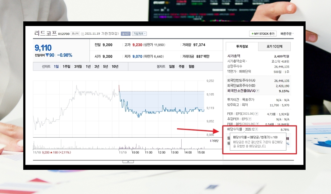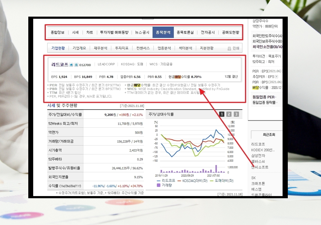 5. 좀 더 자세히 알고 싶은 주식 종목의 이름을 클릭해 보세요. 그럼 해당 종목에 대한 자세한 정보를 담고 있는 페이지가 열리는데요. 저는 배당금 높은 종목 중 하나인 리드코프를 선택해 보았어요.