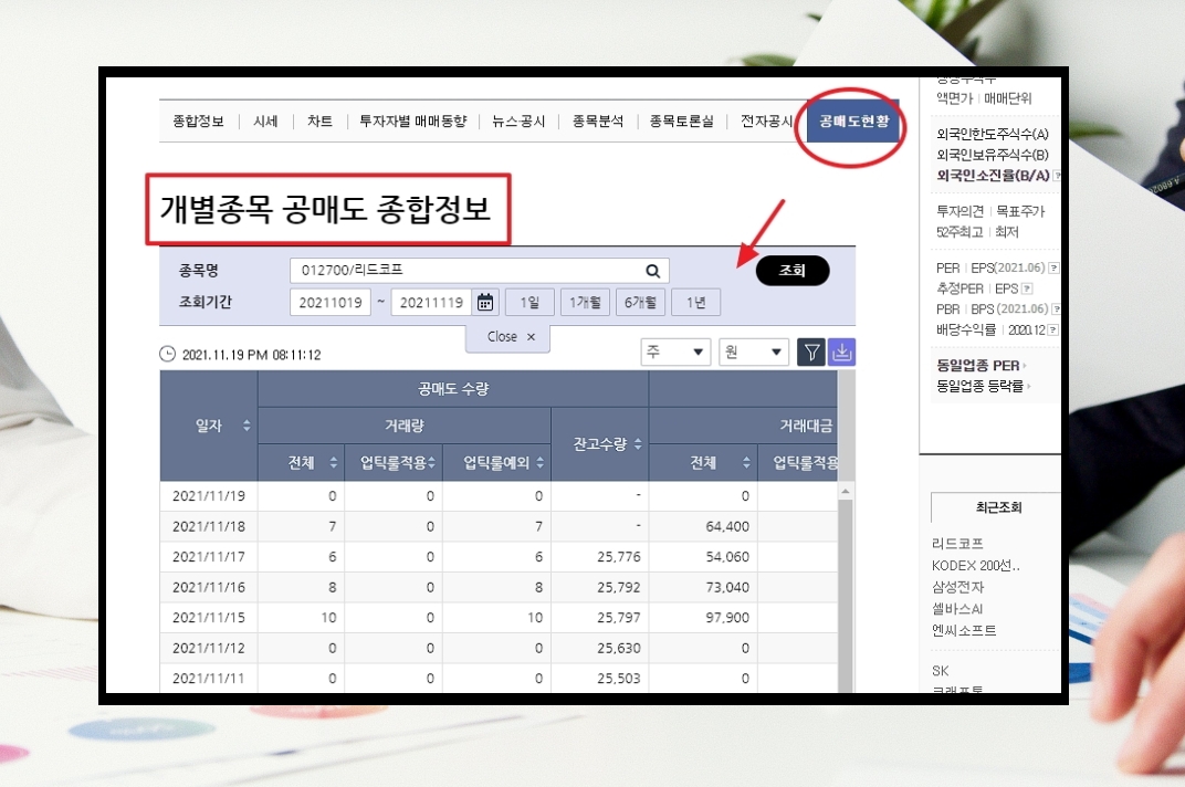 7. 요즘 주식 시장에서 공매도가 이슈인데요. 아무래도 공매도를 많이 한 경우 주가가 올라가기 힘들 수 있어요. 이러한 것을 확인해보려고 메뉴에서 "공매도 현황"을 클릭해 보세요. 그럼 개별종목 공매도 종합정보 표를 만나볼 수 있어요.