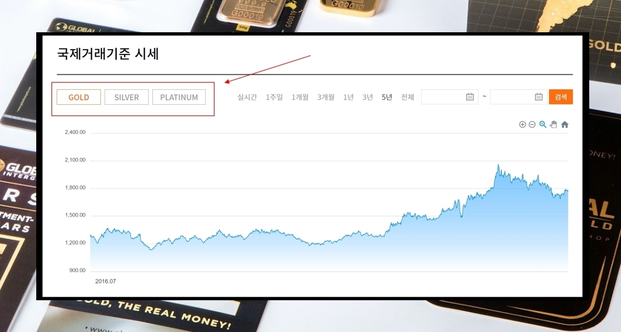 6. 이곳에서는 국제거래기준으로 금시세를 알아볼 수도 있는데요. 이 때에는 1돈 기준이 아니고 온스 기준입니다. Gold, Silver, Platinum 이렇게 3가지 광물에 대한 오늘 가격을 확인할 수 있어요.
