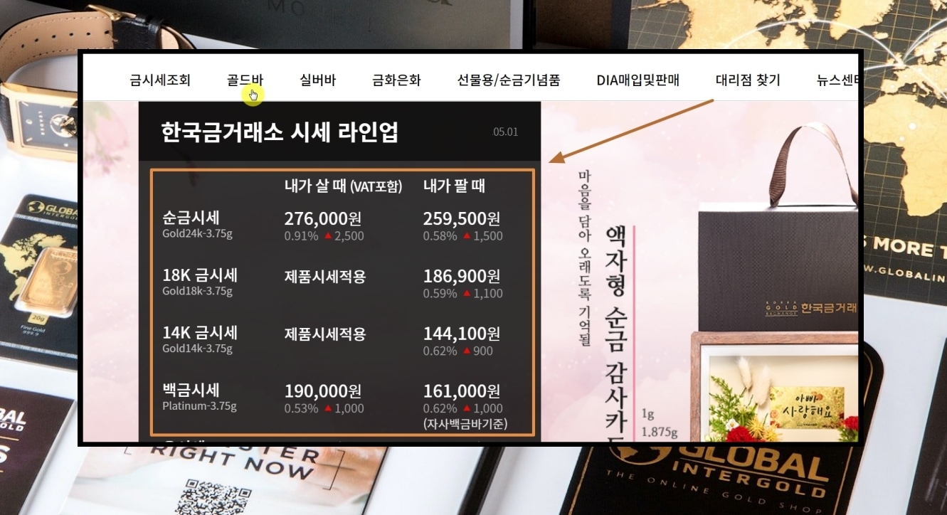 1. 매일매일 금값을 알아볼 수 있는 사이트가 있습니다. 이곳에서 관련 상품을 구입할 수도 있는데요. 사이트에 접속해서 오늘 구매하려면 또는 팔려면 얼마나 하는지 가격을 알아보도록 하겠습니다.