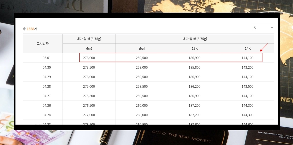 2. 사이트에 접속하면 메인화면을 통해 오늘 금시세 1돈에 대한 정보를 확인할 수 있습니다. 내가 살 때와 팔 때의 액수가 다르네요. 아무래도 수수료 같은 것이 있나봅니다. 여기에 더하여 18k와 14k에 대한 정보도 확인할 수 있어요. (조회 시기에 따라 매일 바뀝니다.)