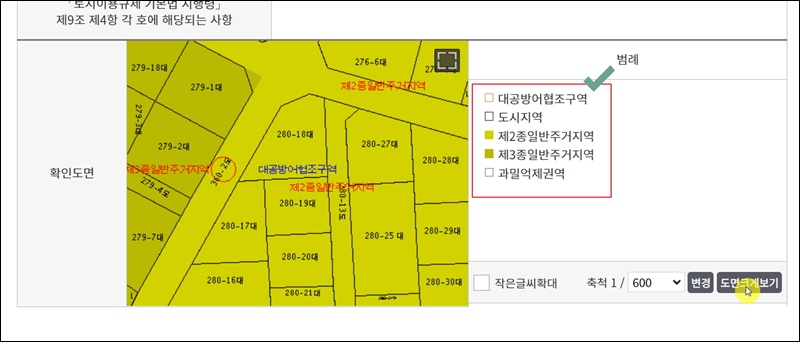 토지이용계획 확인원에는 확인도면이 포함되어 있는데요. 범례를 통해 대공방어협조구역, 도시지역, 과밀억제권역, 제2종 일반주거지역, 제3종 일반주거지역, 과밀억제권역은 어떻게 구분하는지 알 수 있어요. 확인도면의 크기가 너무 작다면 "도면크게보기" 버튼을 누르면 돼요.
