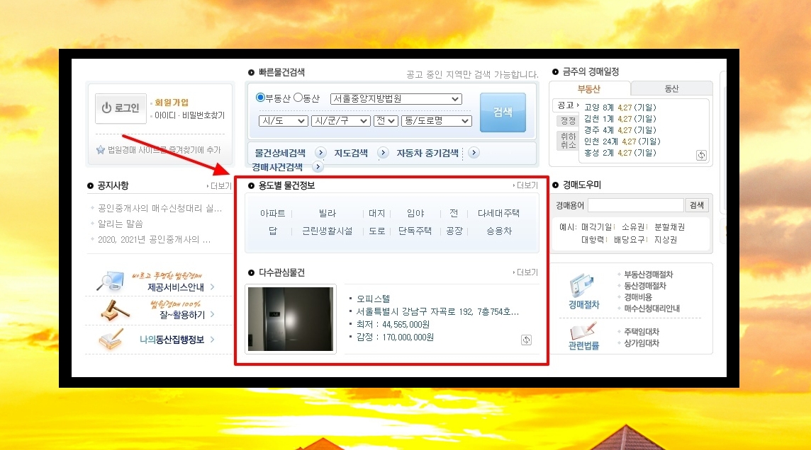 최근 금리 상승으로 인하여 저렴하게 나온 건물, 토지, 자동차 등의 경매물건에 관심이 있는 분들이 많을 거에요. 이럴 때 어떻게 시작하면 좋은지 온라인 이용 방법을 알려드리도록 하겠습니다.