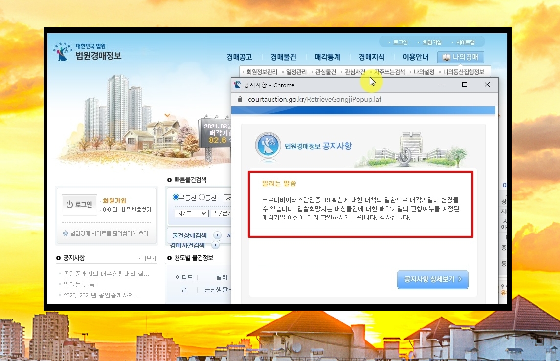 2. 일단 법원경매정보 사이트를 이용할 공지사항을 한 번 확인해 주세요. 최근 바이러스 때문에 매각기일이 변경될 수 있다고 합니다. 이러한 부분을 알고 있어야 문제를 사전에 예방할 수 있습니다.