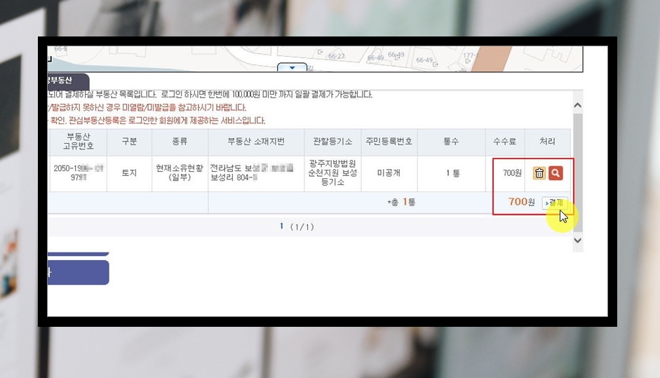 3. 참고로 인터넷으로 등기부등본을 열람하는 경우에도 수수료가 발생해요. 700원인데요. 인터넷으로 발급을 받는 경우에는 1000원이에요.
