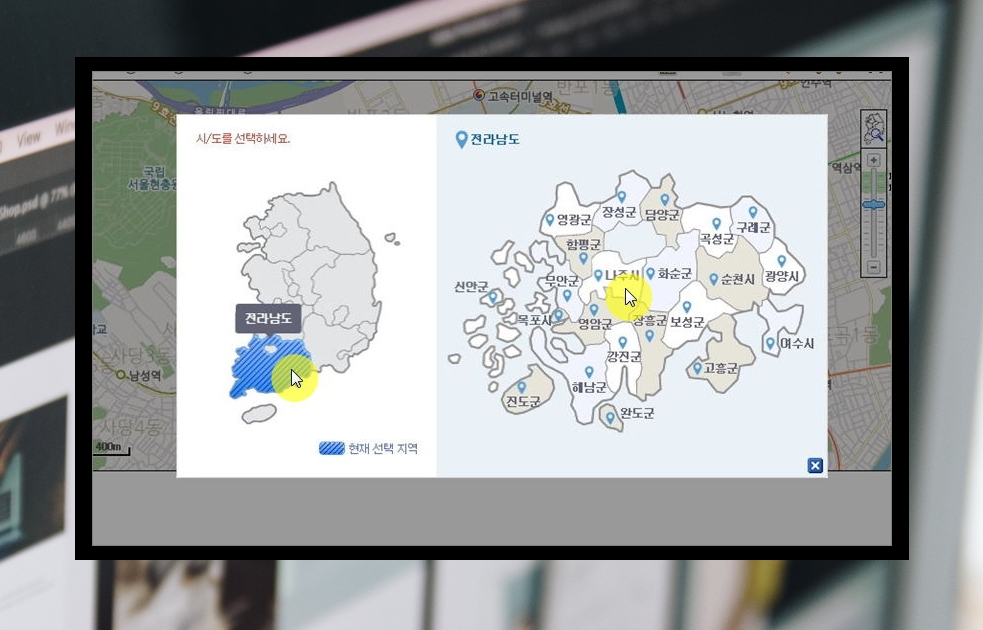5. 서울, 경기 지역은 물론이고, 전라도, 경상도 등 국내 모든 지역을 고를 수 있어요. 시군구까지 선택해 보세요.