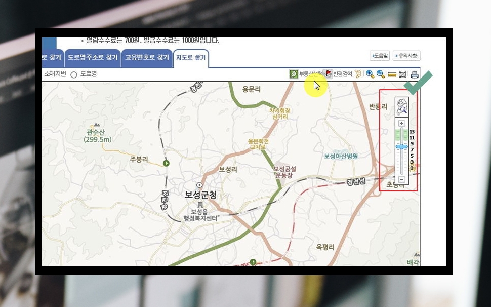 6. 지도 화면이 나타나면 드래그르 통해 등본 열람을 하고자 하는 곳을 찾아주세요. 그 다음 지도 서비스 우측에 있는 화면 확대 기능을 통해 11단계 이상으로 높여 주세요.