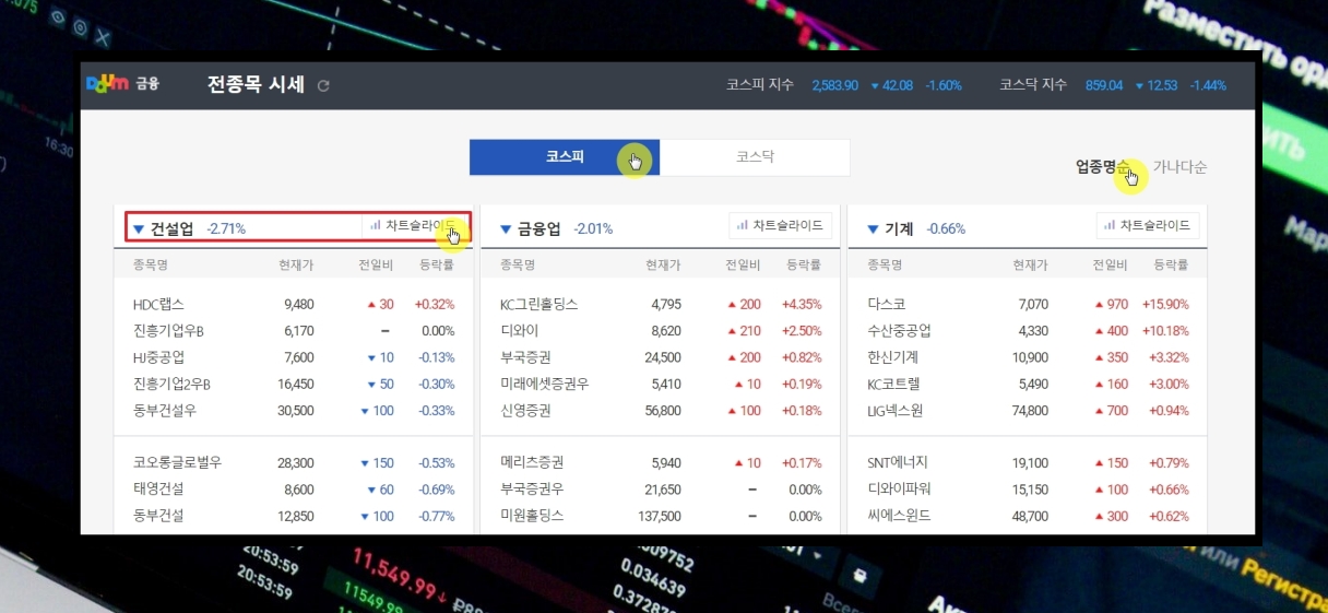 4. 새롭게 열린 페이지를 통해 오늘 주식 가격을 종목별로 살펴볼 수 있는 표가 나왔습니다. 이번에는 업종명순으로 시세표를 정렬해 보았습니다. 이에 따라 업종별 지표와 해당 업종에 속한 개별 가격을 확인이 가능합니다. 현재가, 전월비, 등락률 이렇게 3가지만 나오는데, 좀 더 상세한 주식정보를 원한다면 회사명을 클릭하면 됩니다. 일단 유용하게 사용할 수 있는 [차트슬라이드]를 이용해 보겠습니다. 집중적으로 알아보고 싶은 업종 이름 옆에 있는 [차트슬라이드]를 클릭해 봅니다.