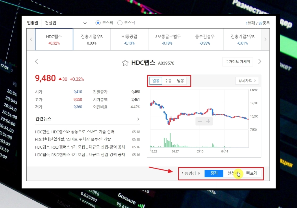 5. 저는 건설업을 선택했습니다. 건설업에 속한 37개의 주식에 대한 데이터를 돌려볼 수 있는 서비스가 나타났습니다. 간단하게 관련 뉴스, 차트가 나타납니다. 화면에서 우측 하단에 있는 자동넘김 기능을 사용하면 천천히 또는 빠르게 여러 회사에 대한 데이터를 자동으로 돌려볼 수 있습니다.