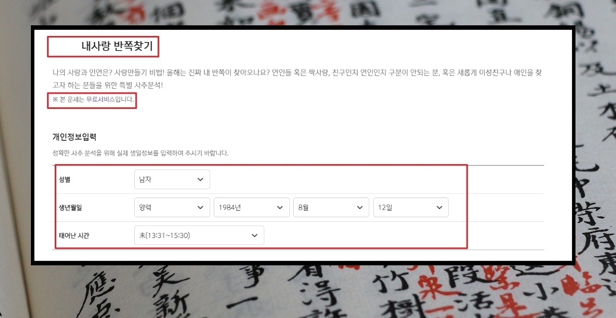4. 토정비결 서비스를 이용하기 위해서는 생년월일, 양력 또는 음력, 태어난 시간, 성별을 입력해야 합니다. 토정비결에 대한 설명을 보면 무료 서비스로 제공되고 있다고 명확하게 적혀 있음을 알 수 있습니다.