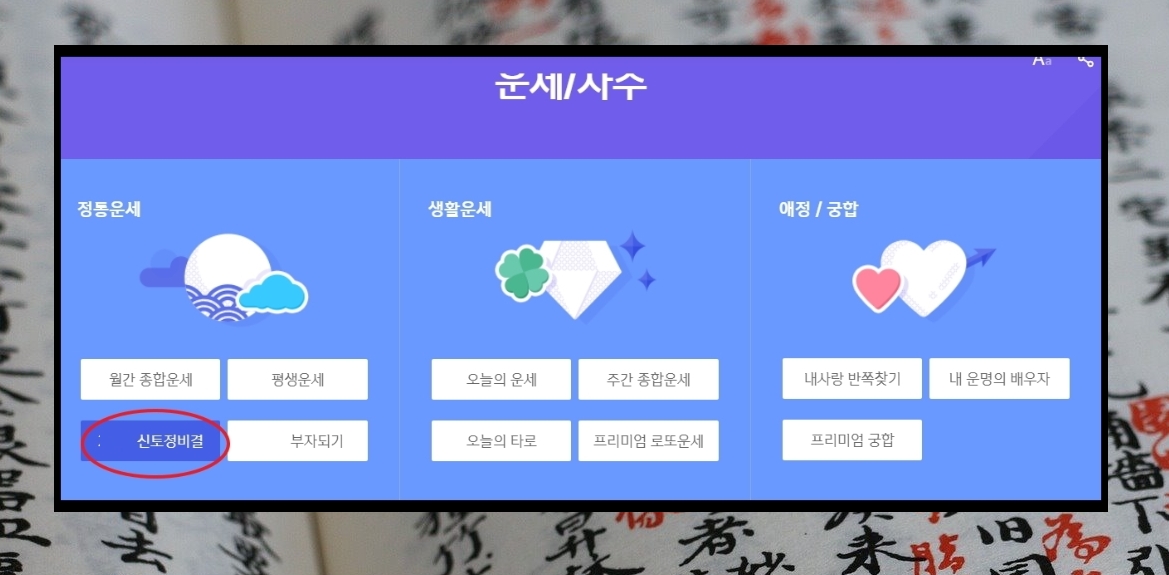 1. 제가 요즘 자주 사용하는 운세 및 사주 서비스의 경우 2023년 신 토정비결 외에도 월간 종합운세, 평생운세, 오늘의 운세, 타로점, 내사랑 반쪽찾기, 프리미엄 궁합 등 다양한 역술 서비스를 이용할 수 있습니다. 무료 이용이 가능한 것임에도 불구하고, 풍부한 해석을 볼 수 있는 곳이죠.