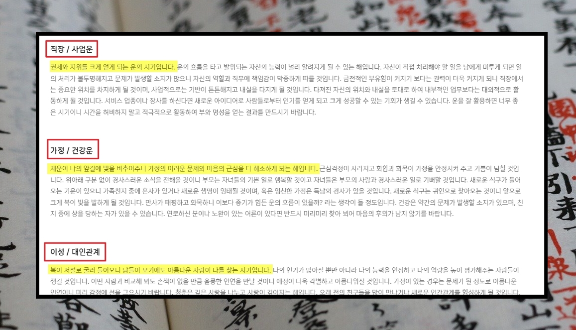7. 재물운 외에도, 직장, 사업, 가정, 건강, 대인관계, 이성에 관하여 토정비결 풀이를 볼 수 있습니다. 2023년에 본인이 집중하고 싶은 부분에 대하여 꼼꼼히 읽어보시길 바랍니다.