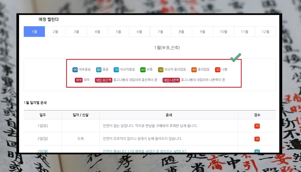 12. 데이트 날짜를 잡고 싶을 때에는 일자별 운세를 참고하면 좋습니다. 점수를 통해 애정운이 좋은 정도를 알려주기 때문에 매우 유용합니다.