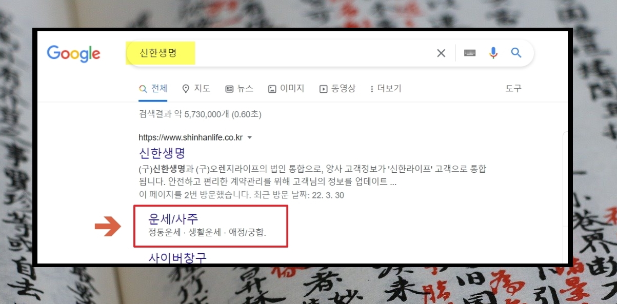 2. 앞서 언급한 역술 서비스는 신한생명 공식 홈페이지에서 제공하고 있습니다. 구글을 이용하면 메뉴 선택 없이 바로 사주 페이지로 이동이 가능합니다.