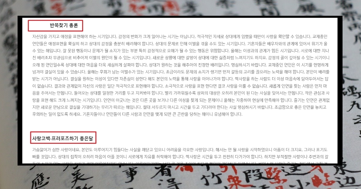 10. 올해 어떤 인연이 있는지 2023년 반쪽찾기 총론을 읽어봅니다. 혹시 좋아하는 사람이 있거나 결혼을 염두하고, 만나는 사람이 있다면 사랑 고백 및 프러포즈하기 좋은 달을 참고하시길 바랍니다.
