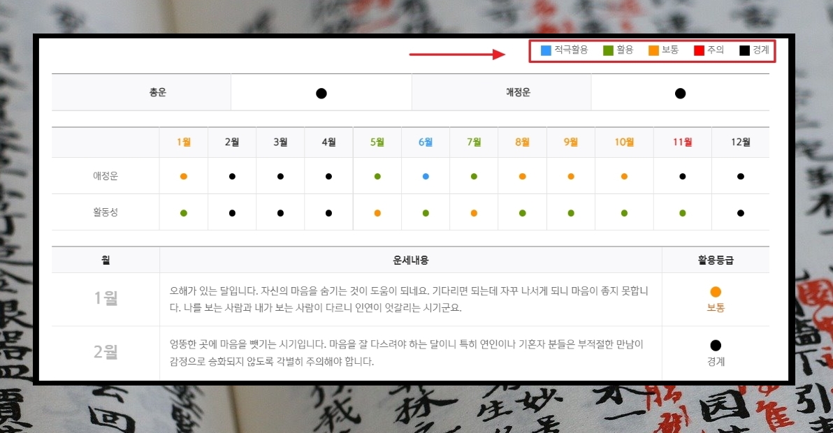 11. 내 사랑 반쪽 찾기의 경우에는 월마다 어떤 애정운과 활동성이 있는지 알 수 있도록 표를 보여줍니다. 정리된 표를 통해 언제가 애정운이 좋은지 바로 인식할 수 있습니다.
