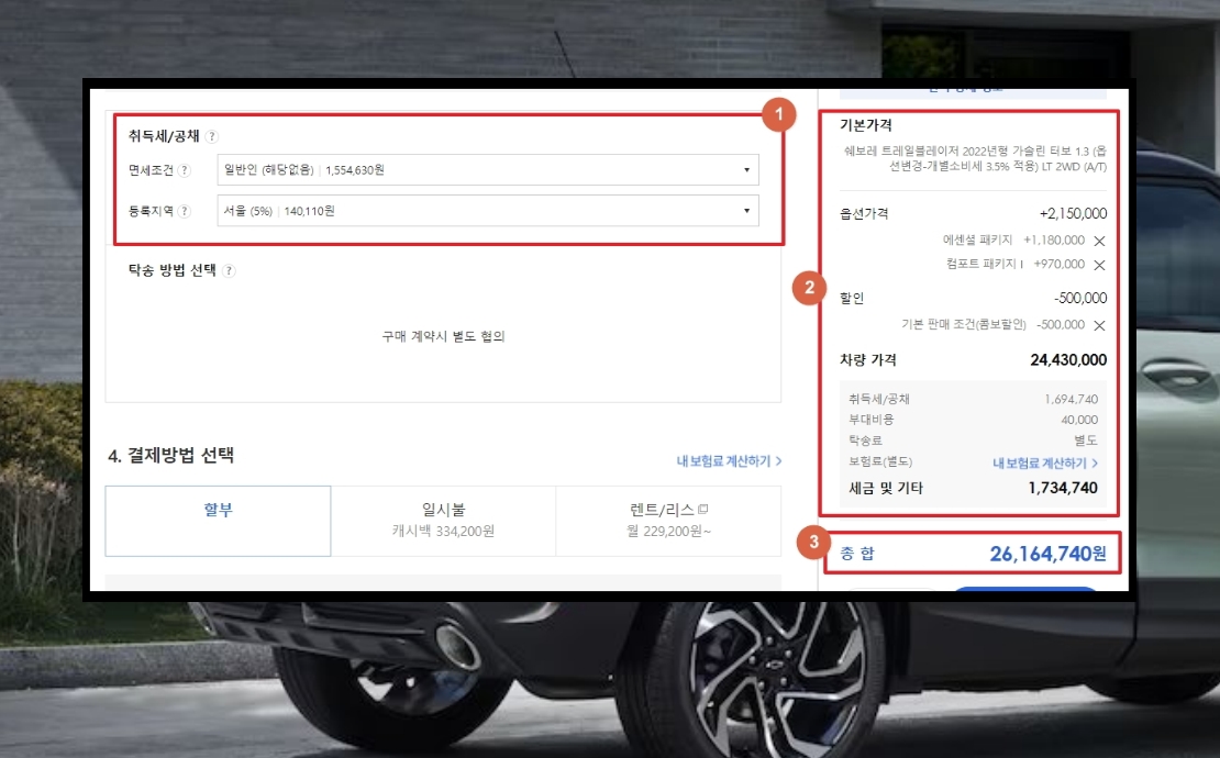 7. 본격적으로 쉐보레 견적을 받아보도록 하겠습니다. 세부모델, 옵션, 할인 및 비용, 결제 방법 이렇게 4가지 과정을 거치면 바로 견적 결과를 확인할 수 있습니다.