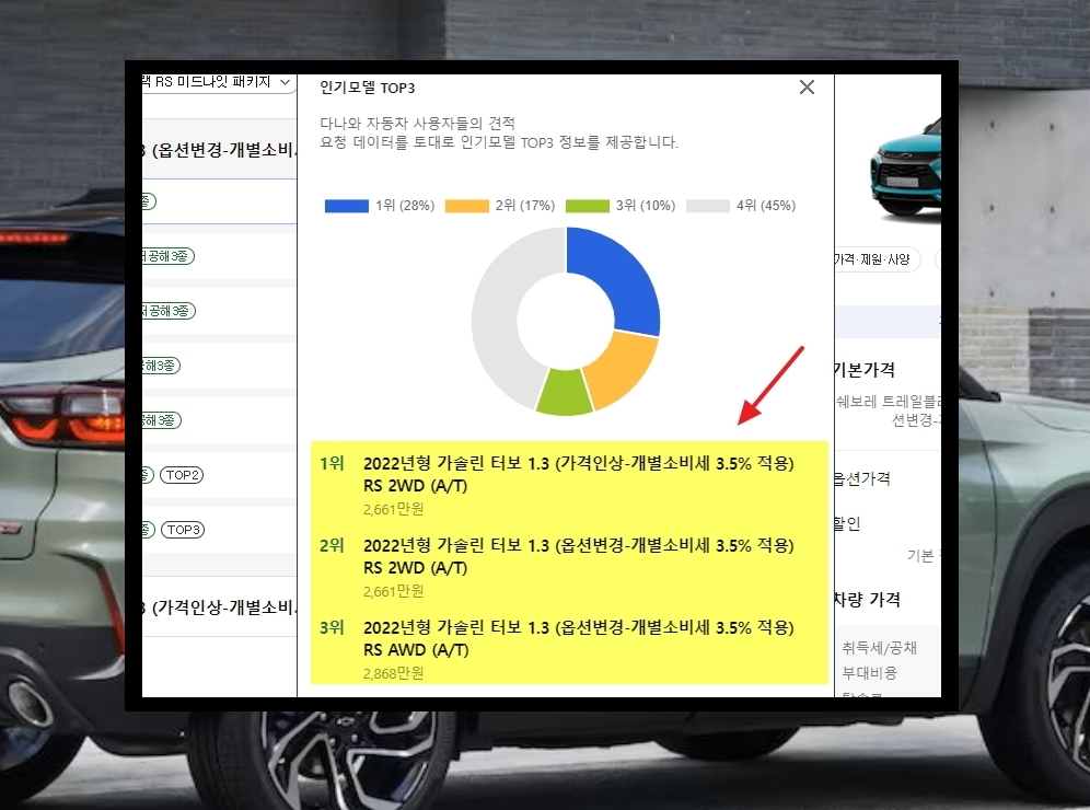 8. 세부모델을 정하지 않은 분들은 [인기모델 TOP3]를 클릭해 봅니다. 그럼 어떤 세부모델이 가장 인기가 많은지 알 수 있습니다.