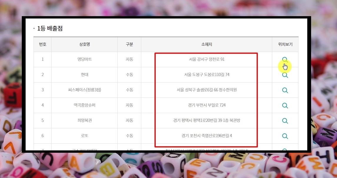 5. 여러 곳의 1등 배출점 정보가 나타났습니다. 길을 걷다가 복권 판매점에 줄을 서서 입장을 기다리는 사람을 본 적이 있을 겁니다. 아무래도 한 번 당첨된 곳에서 또 나올 확률이 높기 때문입니다. 미신이라고 생각할 수 있겠지만, 굳이 1등 배출점을 이용하지 않을 필요도 없으니 가까운 곳에 있다면 이용해 보세요. 로또 당첨될 확률이 1퍼센트라도 올라갈 겁니다.