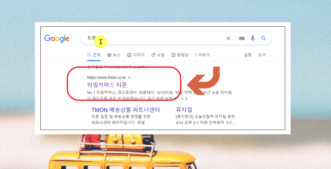 3. 티몬 사이트에 접속하면 맨 위에 검색 창이 하나 보이실텐데요. 여기에서 "제주도 렌트카"를 입력한 후 엔터키를 눌러보세요.