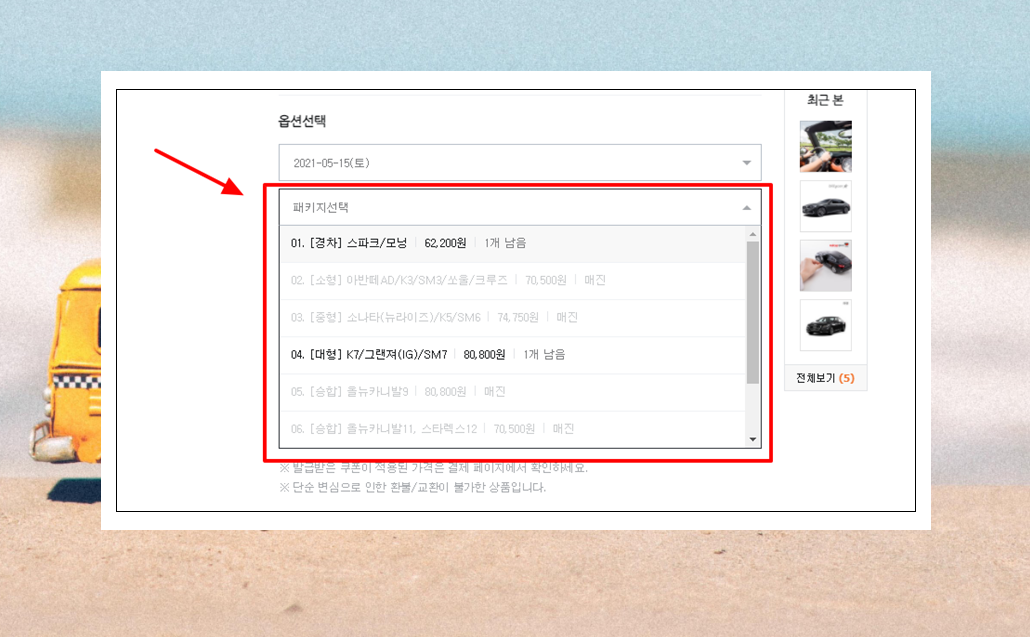 5. 렌트카의 경우 이용하는 날짜에 따라 이용료 차이가 있을 수 있어요. 보통 제주도와 같은 여행지는 주말에 조금 더 비싸죠. 옵션 선택에서 이용하고자 하는 날짜를 선택해 주세요.