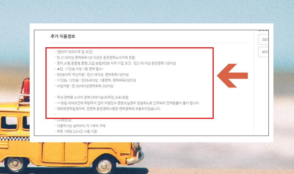 7. 예약 버튼을 누르면 바로 예약 진행이 가능한데요. 오프라인에서도 동일하지만, 온라인에서 해당 서비스를 신청하거나 이용할 때에 제공되는 정보나 추가사항 등을 꼼꼼히 읽어보는 것이 좋아요. 대여자격, 조건 등 필히 알고 있어야 하는 사항이 있기 때문이에요. 단순히 가격비교를 통해 저렴한 제주도 렌트카를 찾기 보다는 이렇게 부수 조건도 괜찮은지 확인할 필요가 있어요.