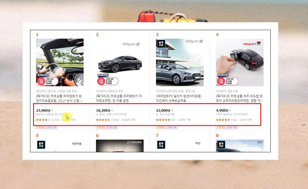 평소에는 물론이고, 성수기에도 이러한 가격비교 서비스를 이용하는 것이 낫습니다. 전체적으로 제주도 렌트카 요금이 성수기에 올라가지만, 그 중에서도 가격 경쟁력 있는 곳을 찾을 수 있기 때문이죠.